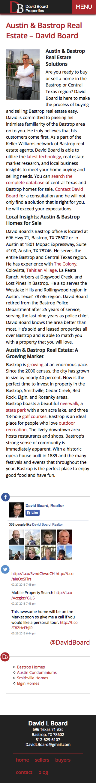 This site is completely responsive. I wrote all the CSS and media queries, no CSS frameworks or JS plugins on this one! I had to write a fair amount of javascript using jQuery to integrate the MLS solution David’s broker uses into the site.